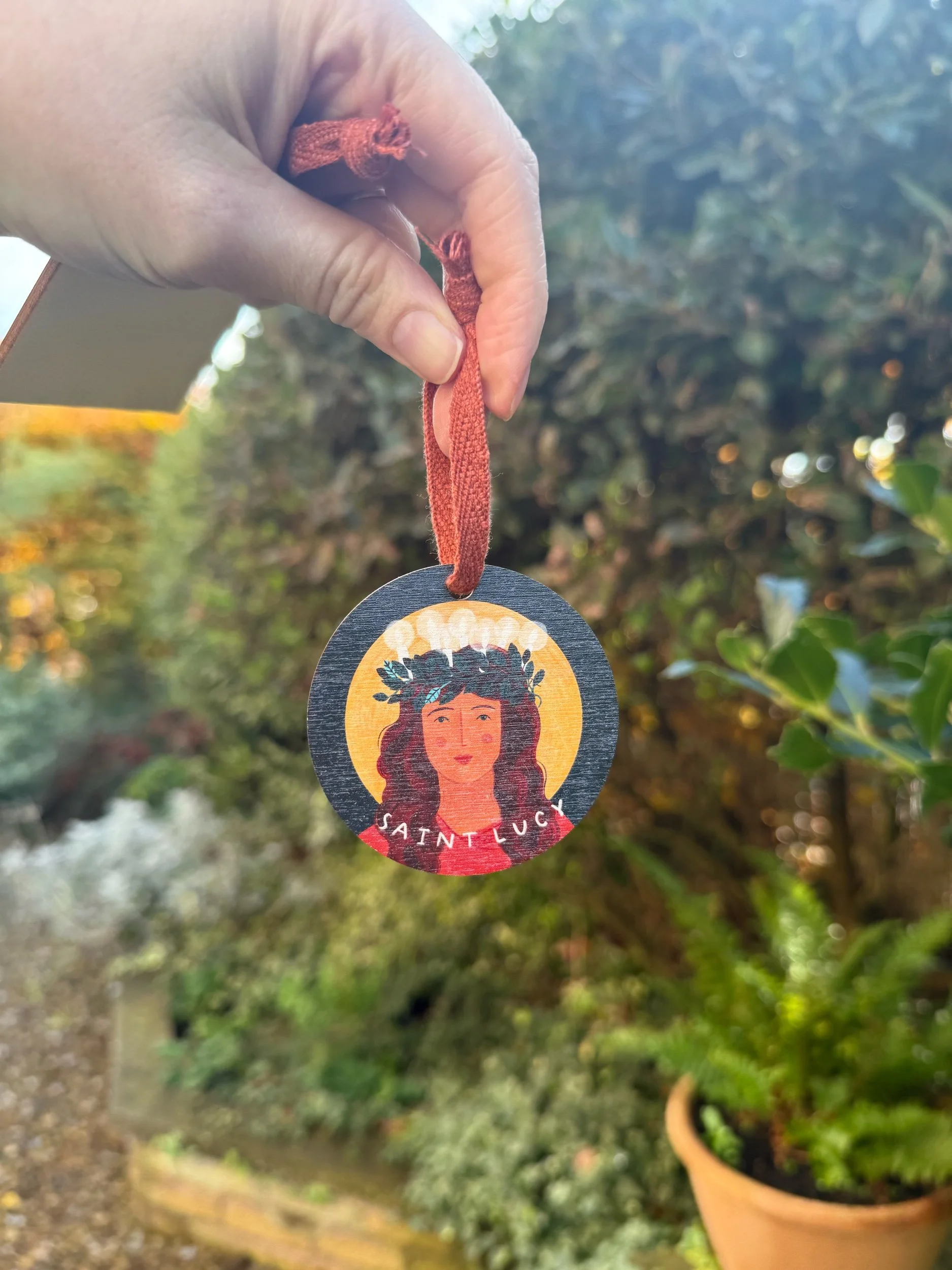 A beautiful wooden decoration featuring St Lucy! 6.5cm in diameter, made of fsc-certified wood and ready strung. Please note that the colour of ribbon used might vary (one of our children has stolen the original rust-coloured one and I am yet to successfully locate it…) but will be beautiful and high quality! The natural wood grain leads to differences in texture and colour across the decorations - this is normal for the printing technique and surface.