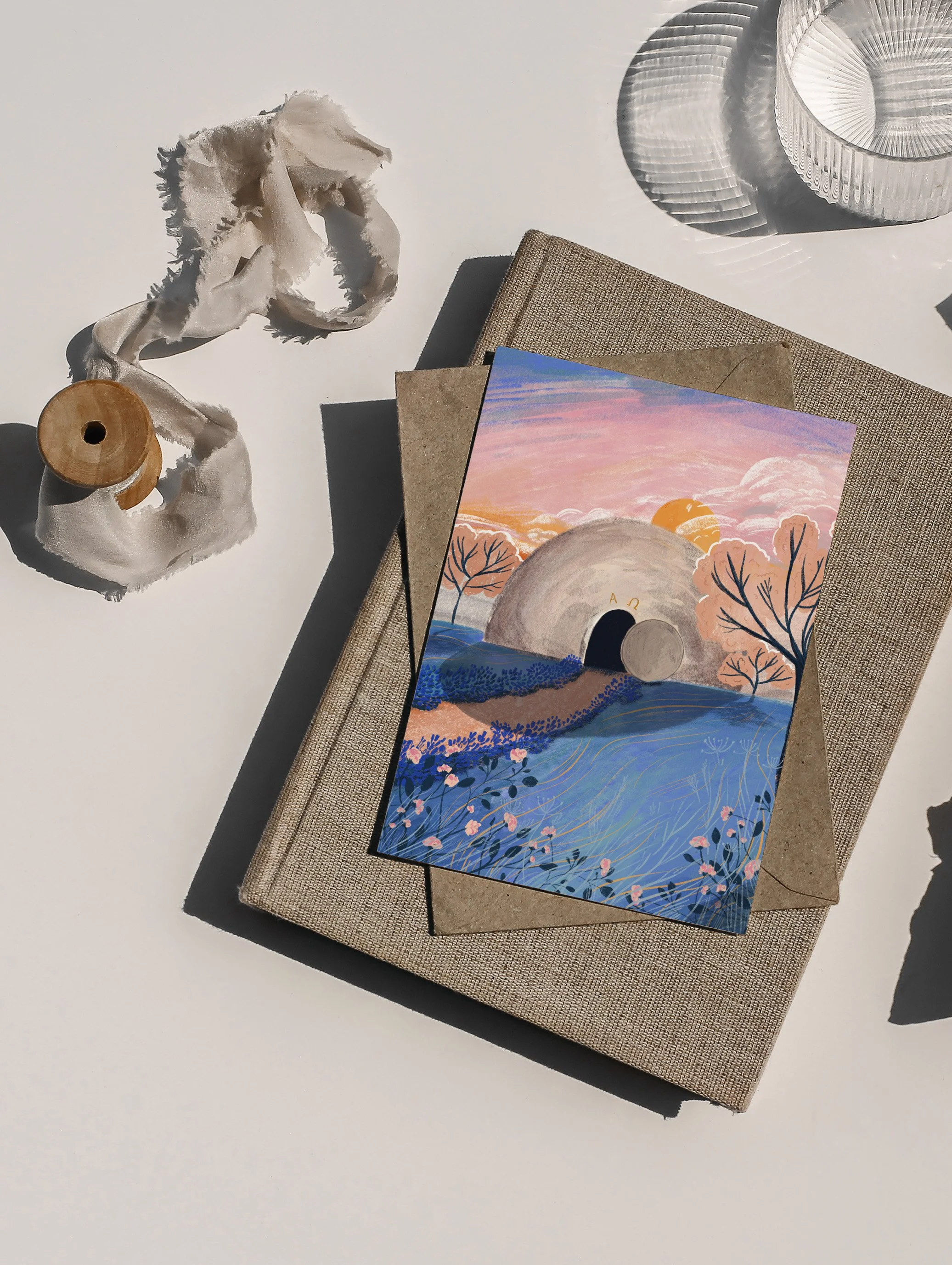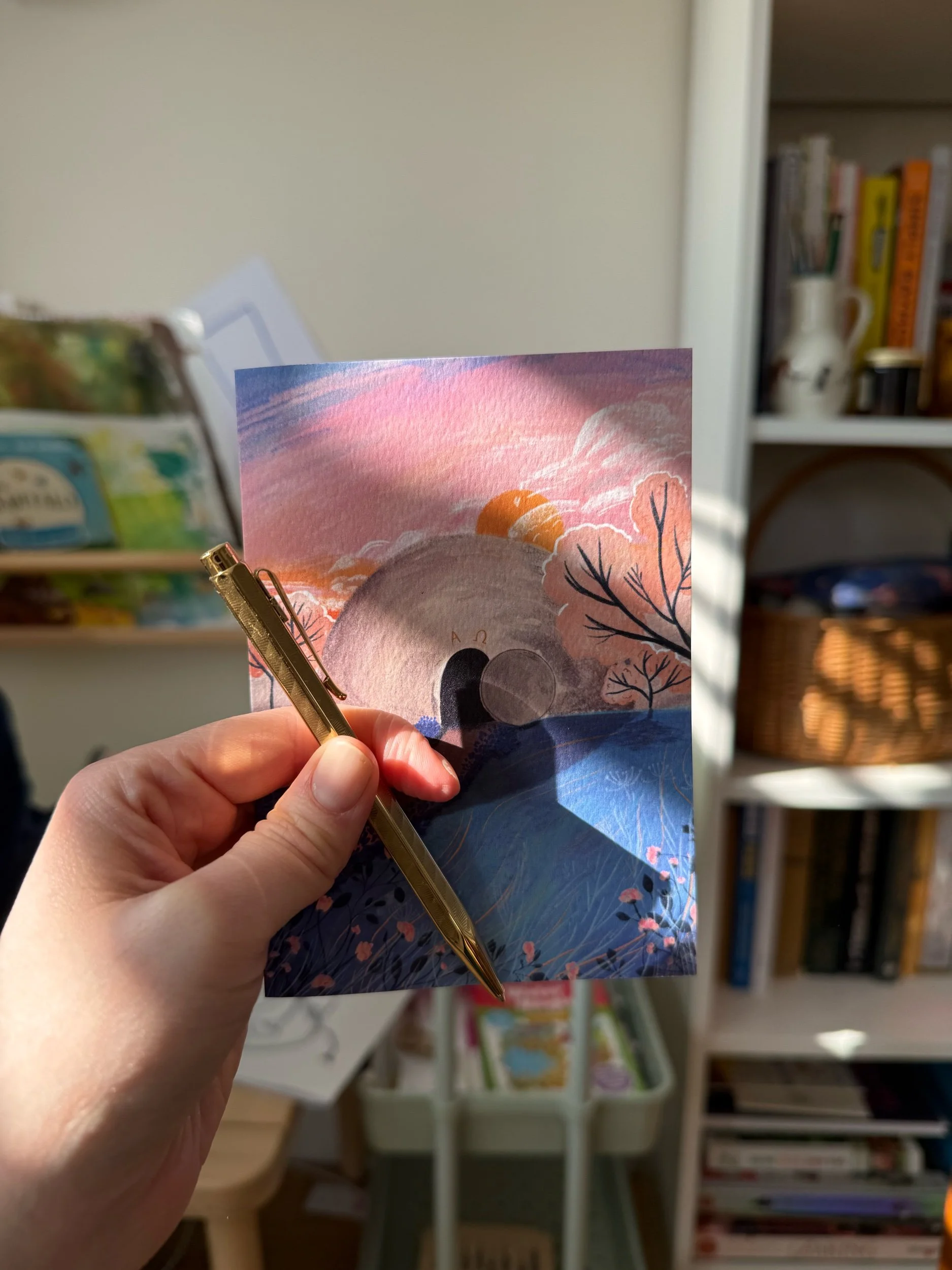 This card has been made from an original illustration of the empty tomb in cool pastel tones. The message inside reads ‘Happy Easter’ followed by ‘He is risen!’ on the next line.