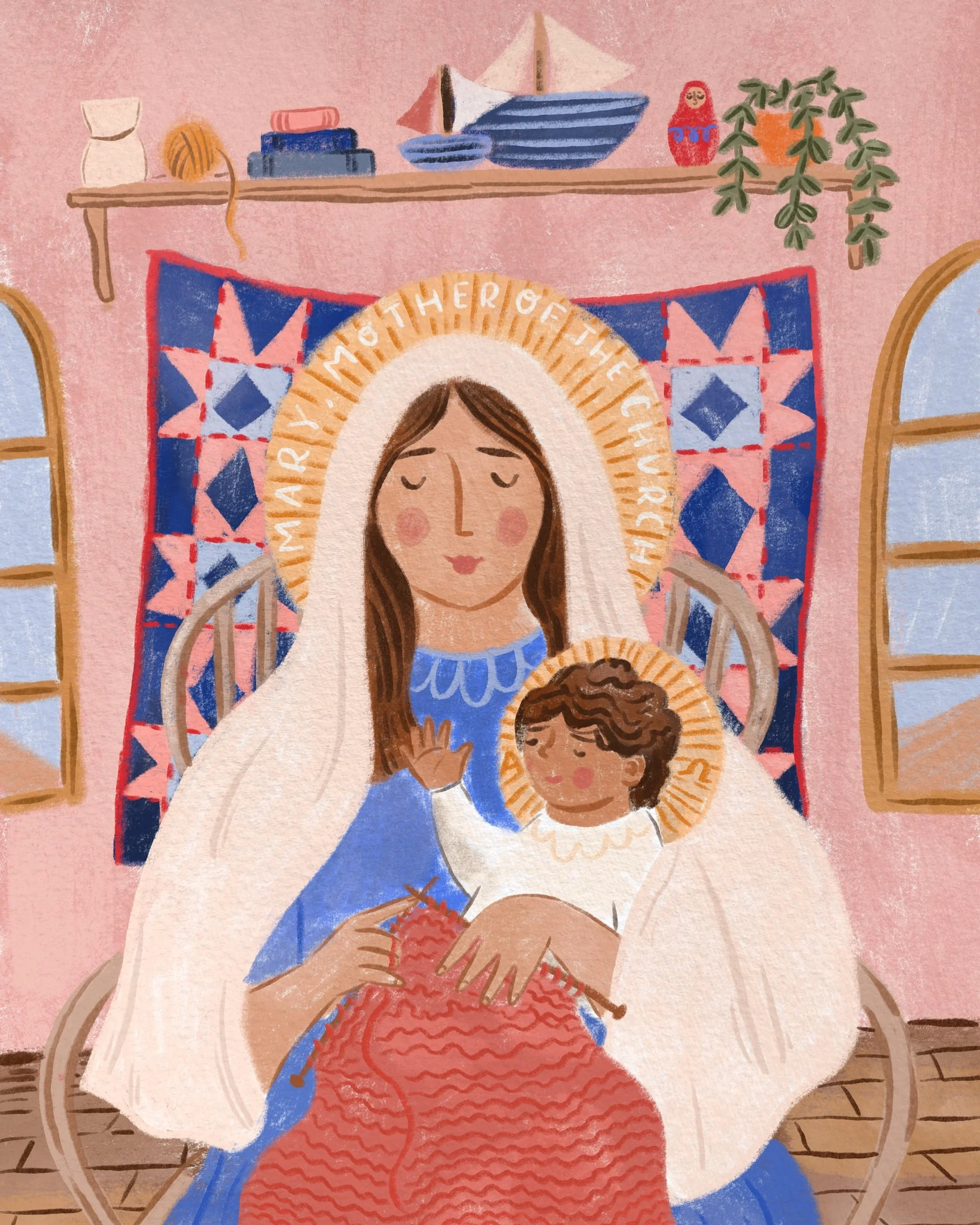 The art of needlework and similar is something we share with other women throughout history and there’s something profoundly feminine and motherly about it. Mary is pictured here as Mother of the Church. She’s the mother of Jesus but also a spiritual mother to all Christians.